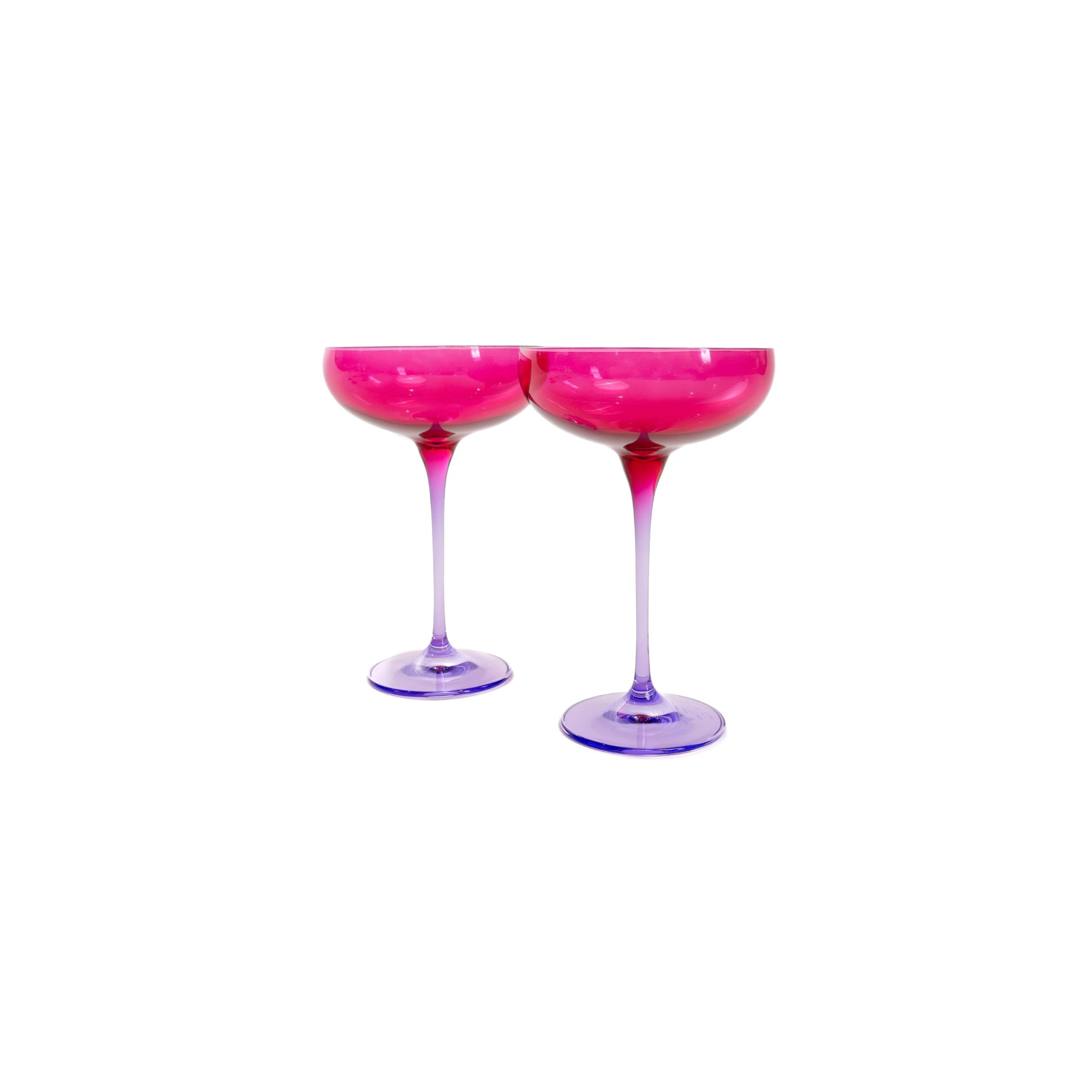 Stemware estelle colored glass estelle colored glass coupe fuchsia & lavender pair Price: $95.00 Qty: 1 2 3 4 5 6 7 8 9 10 11 12 13 14 15 16 17 18 19 20 - Limited Edition Product - Made by glass artisans in Poland - Set of 2- Dimensions: 7.25 inches tall x 4.4 inches wide- Capacity: 8.25 ounces - Quality: Lead, Cadmium and BPA free. - Care Instructions: Hand wash only.