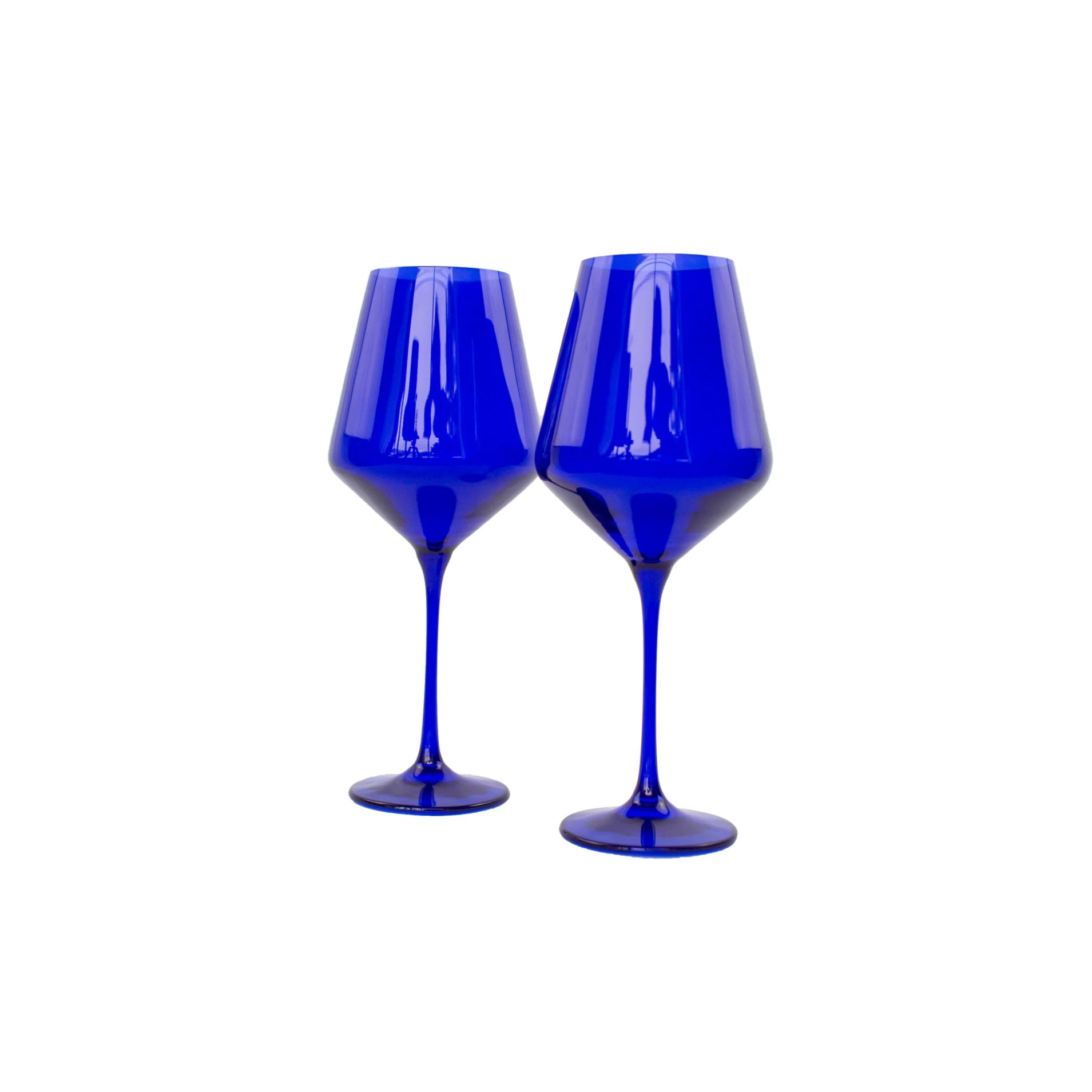 Stemware estelle colored glass estelle colored glass stemware royal blue pair Price: $85.00 Qty: 1 2 3 4 5 6 7 8 9 10 11 12 13 14 15 16 17 18 19 20 - Hand-blown colored glass made by glass artisans in Poland- Set of 2- Dimensions: 9.5 inches tall x 3.9 inches wide- Capacity:16.5 ounces- Care Instructions: Hand wash only.