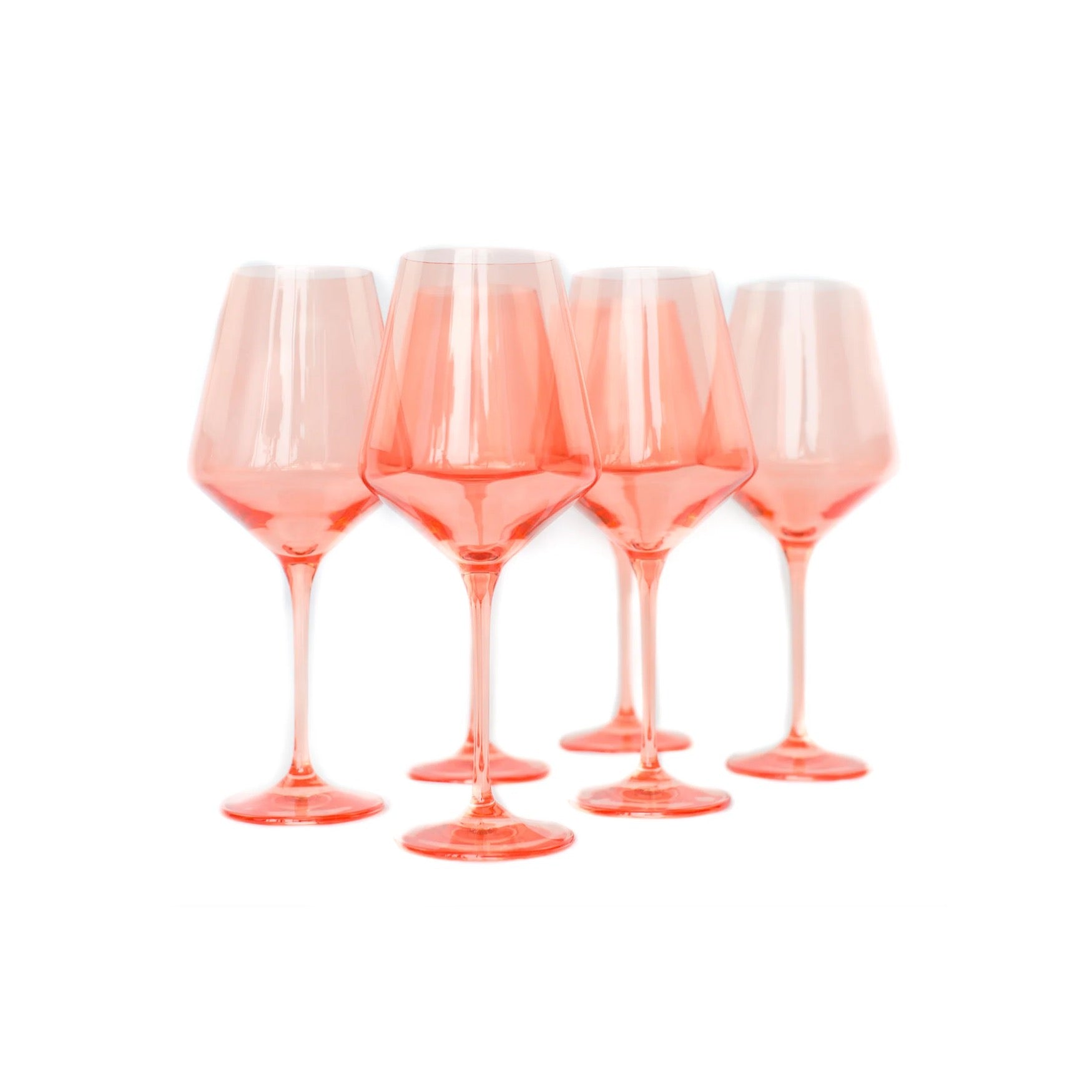 Stemware estelle colored glass estelle colored glass stemware coral peach set of six Price: $185.00 Qty: 1 2 3 4 5 6 7 8 9 10 11 12 13 14 15 16 17 18 19 20 - Hand-blown colored glass made by glass artisans in Poland - Set of 6 - Dimensions: 9.5 inches tall x 3.9 inches wide - Capacity:16.5 ounces - Care Instructions: Hand wash only.