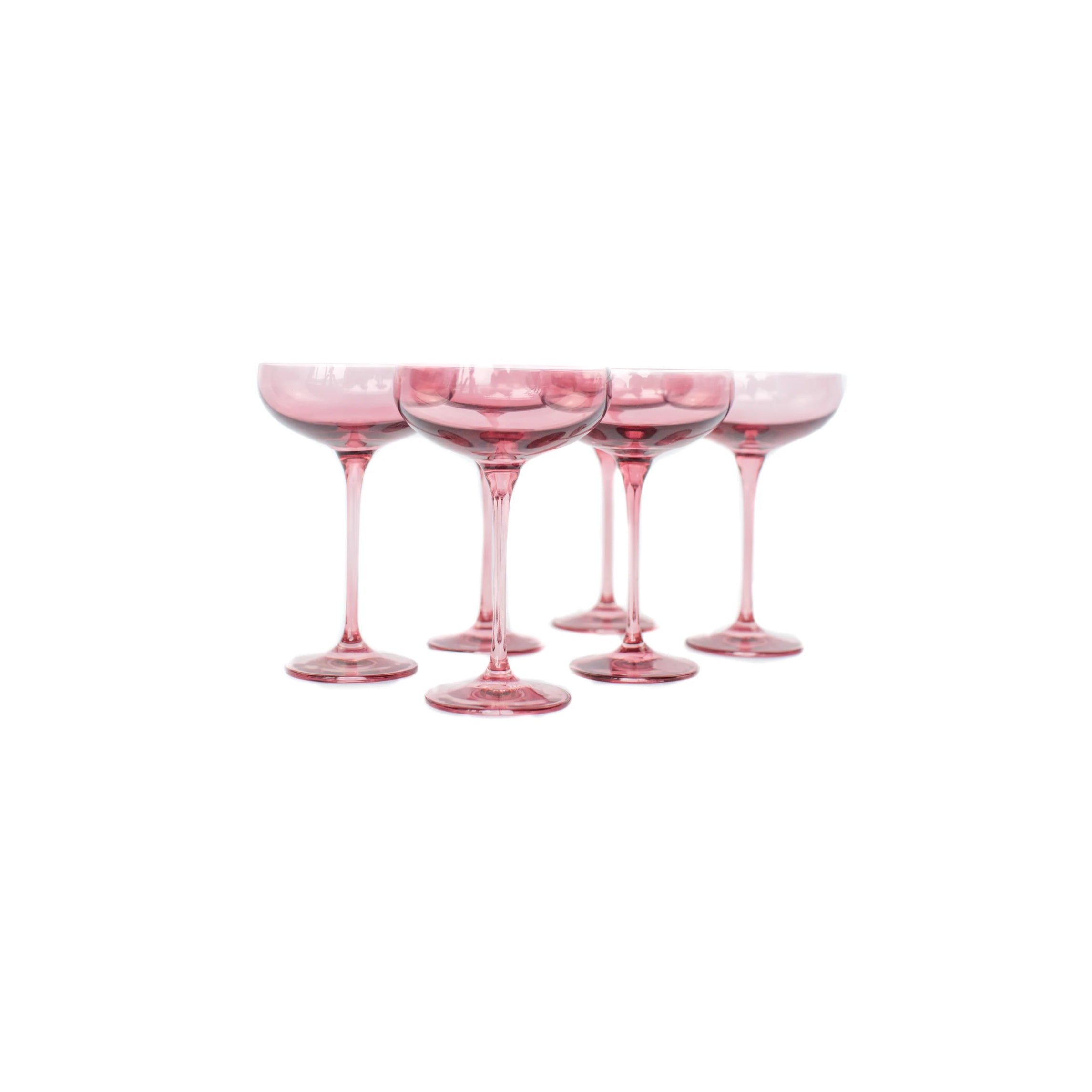 Stemware estelle colored glass estelle colored glass coupe rose glasses, set of six Price: $205.00 Qty: 1 2 3 4 5 6 7 8 9 10 11 12 13 14 15 16 17 18 19 20 Made by glass artisans in Poland- Set of 6- Dimensions: 7.5 inches tall x 4.4 inches wide- Capacity: 8.25 ounces - Quality: Lead, Cadmium and BPA free.- Care Instructions: Hand wash only.