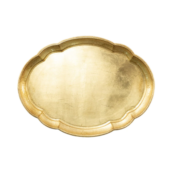 Traditional Gifts vietri florentine gold oval tray large Price: $168.00 Qty: 1 2 3 4 5 6 7 8 9 10 11 12 13 14 15 16 17 18 19 20 Maestro artisans handcarve each beautiful curve of the Florentine Wooden Accessories Gold Large Oval Tray before applying a signature gold leaf. This timeless collection is handcrafted in Florence, Italy, home to the Renassiance and the influential Medici family. 21.75""L, 16""W
