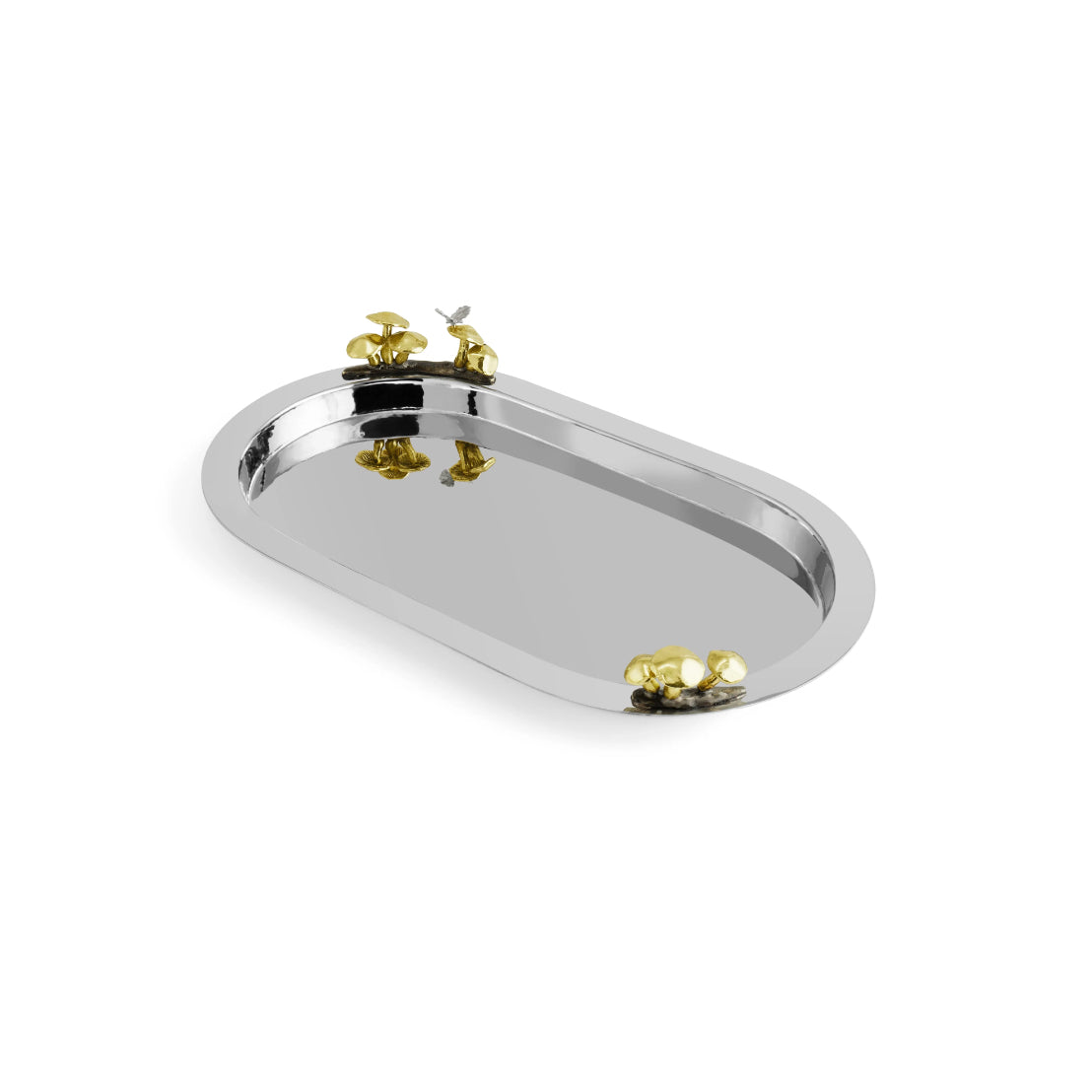 Contemporary Gifts michael aram mushroom tray Price: $235.00 Qty: 1 2 3 4 5 6 7 8 9 10 11 12 13 14 15 16 17 18 19 20 DETAILS 15"" Lx 8.5"" W x 2.5"" H MATERIALS Stainless Steel Natural & Oxidized Brass Nickelplate Not dishwasher safe As with all metals, never place in microwave oven Avoid any detergent with lemon or other acidic agents Do not soak, even in plain water, or leave unwashedovernight Hand wash with gentle detergent, dry immediatelywith soft cloth
