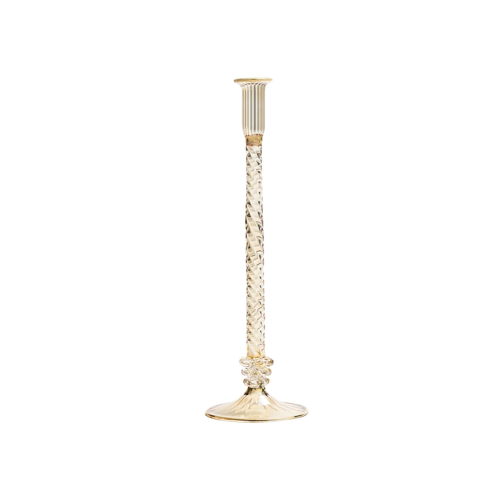 Contemporary Gifts kim seybert braid candle holder, champagne Price: $70.00 Qty: 1 2 3 4 5 6 7 8 9 10 11 12 13 14 15 16 17 18 19 20 The mouth-blown, hand-molded glass Braid Candlestick stands tall, with an elongated braided stem atop a detailed base. Hand-applied color baked at high temperatures produces a gorgeous iridescent luster, accented by 18K gold bands. A refined candlestick that elevates any table setting. Expect shape, size, and color variation due to their hand-crafted nature. DIMENSIONS: 4"" Length x 4"" Width x 14.4"" Height Glass