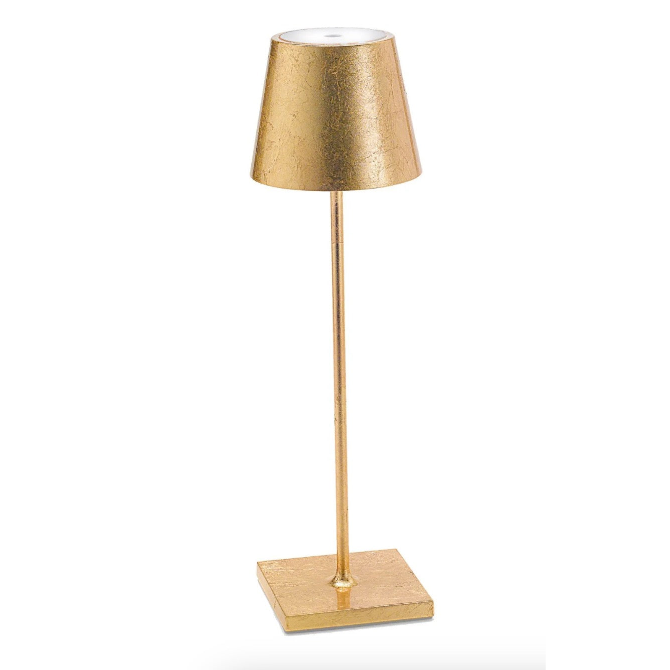 Contemporary Gifts zafferano poldina pro lamp tall, gold leaf Price: $299.00 Qty: 1 2 3 4 5 6 7 8 9 10 11 12 13 14 15 16 17 18 19 20 Touch on/off dimmable LED table lamp Contact induction charging base with USB included LED light with polycarbonate diffuser 9+ hours cordless illumination Indoor/outdoor use (powder-coated finishes) Rechargeable battery 1-year warranty4.3"" sq. base x 15"" height