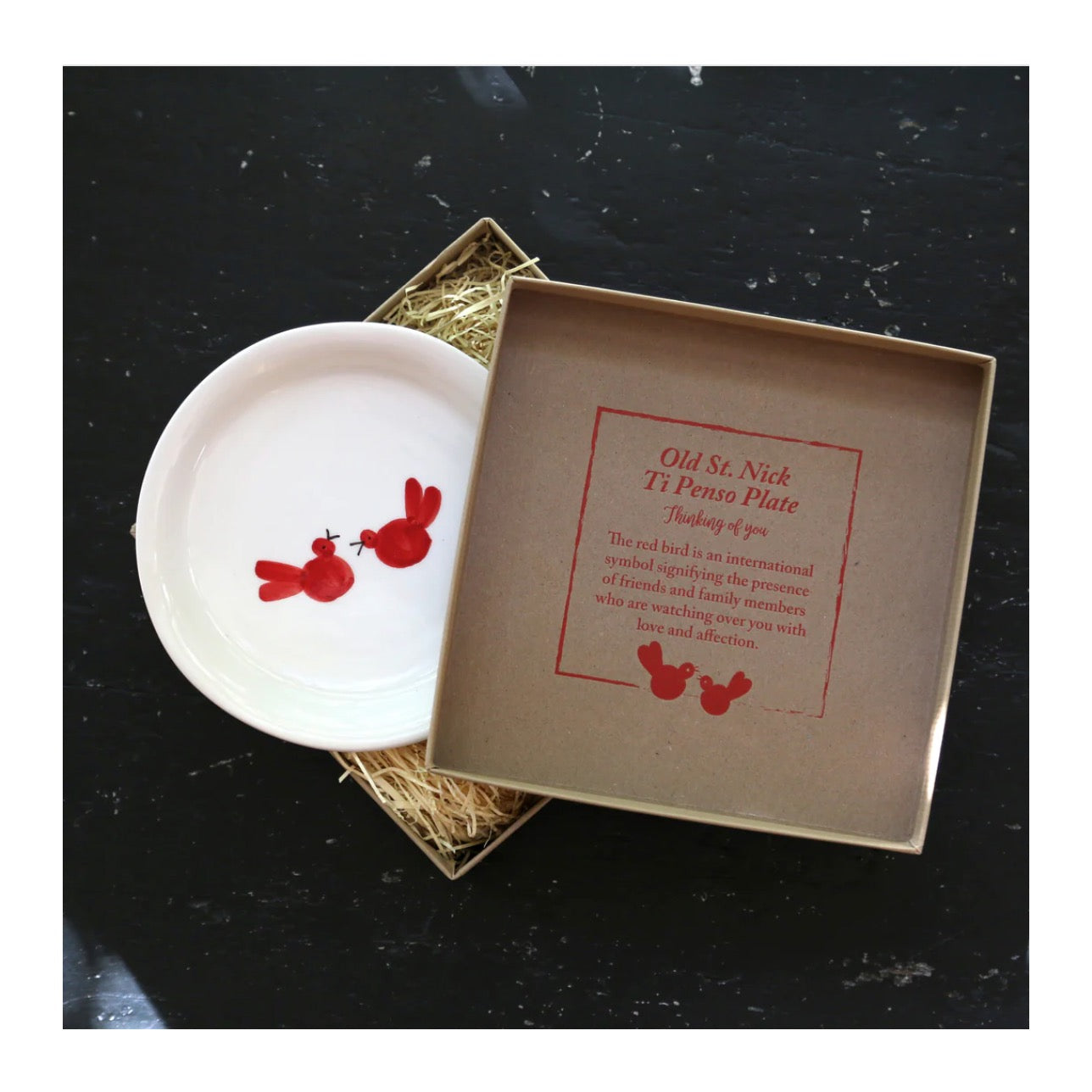 Contemporary Gifts vietri ti penso plate Price: $45.00 Qty: 1 2 3 4 5 6 7 8 9 10 11 12 13 14 15 16 17 18 19 20 When you see a red bird, know a loved one is near. Ti penso, meaning ""Thinking of you,"" symbolic on the Old St. Nick Ti Penso Plate, is a gentle reminder that our loved ones are watching over us. Product Dimensions: 6.25""D