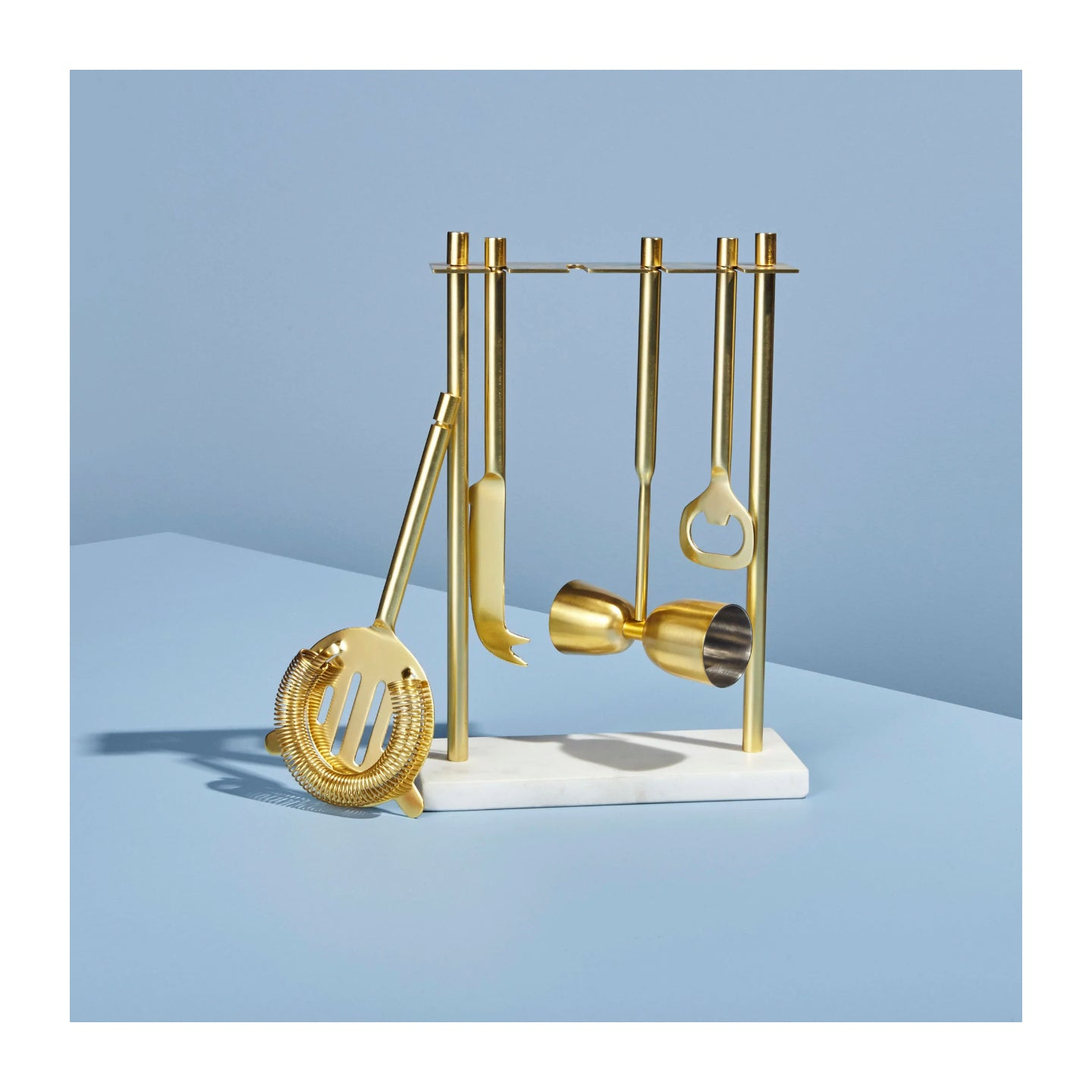 Contemporary Gifts be home luxe hanging bar tool set Price: $88.00 Qty: 1 2 3 4 5 6 7 8 9 10 11 12 13 14 15 16 17 18 19 20 All that glitters may not be gold, but these aurous bar tools certainly are. Serve up some sparkle at your next cocktail event with our Luxe collection, featuring premium quality kitchen gadgets in your favorite shades of gold. Measurements: 3"" x 7.25"" x 10.25"" Set includes 4 hanging bar tools & marble stand. Ethically crafted in small batches. Imbued with a food-safe coating.