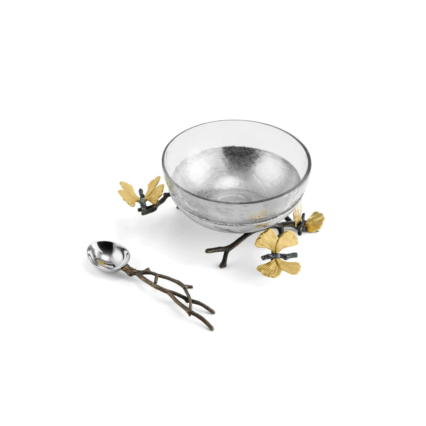 Contemporary Gifts michael aram butterfly ginkgo glass nut dish with spoon Price: $185.00 Qty: 1 2 3 4 5 6 7 8 9 10 11 12 13 14 15 16 17 18 19 20 8.25""L x 6.5""W x 3.5""H Removable Bowl 2.5""H, 5.75"" Dia. Spoon 6""L Hand Textured Stainless Steel Natural & Oxidized Brass Glass