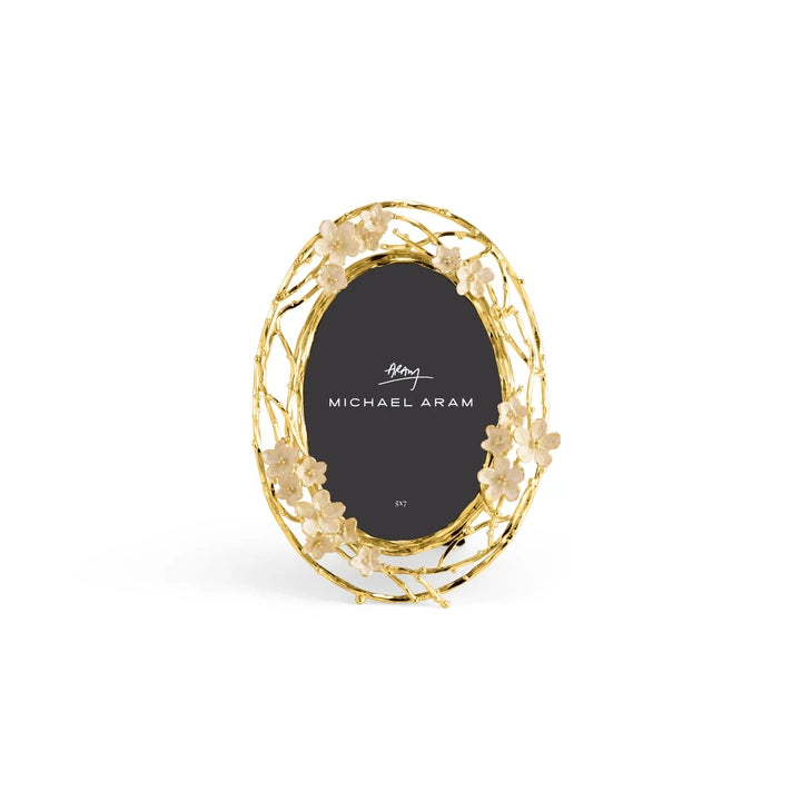 Contemporary Gifts michael aram cherry blossom oval frame 5x7 Price: $185.00 Qty: 1 2 3 4 5 6 7 8 9 10 11 12 13 14 15 16 17 18 19 20 The Cherry Blossom Collection is inspired by the liveliness and vitality of the Japanese flower as it blossoms each Spring. Embodying the ideals of renewal, Michael is captivated by the intricate nature of the flower and the symbolism that it holds. Representing fragility and the beauty of life, the Cherry Blossom Collection combines soft, muted pink tones with golden brass and white marble to add a delicacy that exhibits the pure beauty of nature. ""I have always been fascinated with the Cherry Blossom and its symbolism with the cycle of life. I find the ephemeral beauty of the blossoms and the way they burst into bloom, however fleetingly, truly inspiring."" DETAILS & MATERIALS Holds 5 x 7 Photo 7""L x 7""W Goldtone Pink Enamel