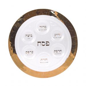 Contemporary Gifts annieglass roman antique gold seder plate Price: $319.00 Qty: 1 2 3 4 5 6 7 8 9 10 11 12 13 14 15 16 17 18 19 20 15 1/2' Handmade Glass Seder Plate Sustainably Made in the U.S.A Durable, Chip-Resistant Dishwasher Safe Annie designed the Annieglass Judaica Seder Plate in honor of the Passover Seder, a Jewish ritual feast marking the beginning of Passover, in which friends and family gather around a beautifully set Seder table. Traditional stories are told, wine is enjoyed, and all partake in symbolic foods placed on the Passover Seder Plate. Annieglass' handmade glass Seder Plate, complete with Hebrew writing and 24k gold or genuine platinum trim, pairs beautifully with Annieglass Roman Antique and Edgey Collections. Durable and dishwasher safe, the Annieglass Seder Plate will last a lifetime of tradition. Available for personalized engraving, the Annieglass Judaica Seder Plate makes for a remarkable Jewish wedding gift or Hanukkah gift.