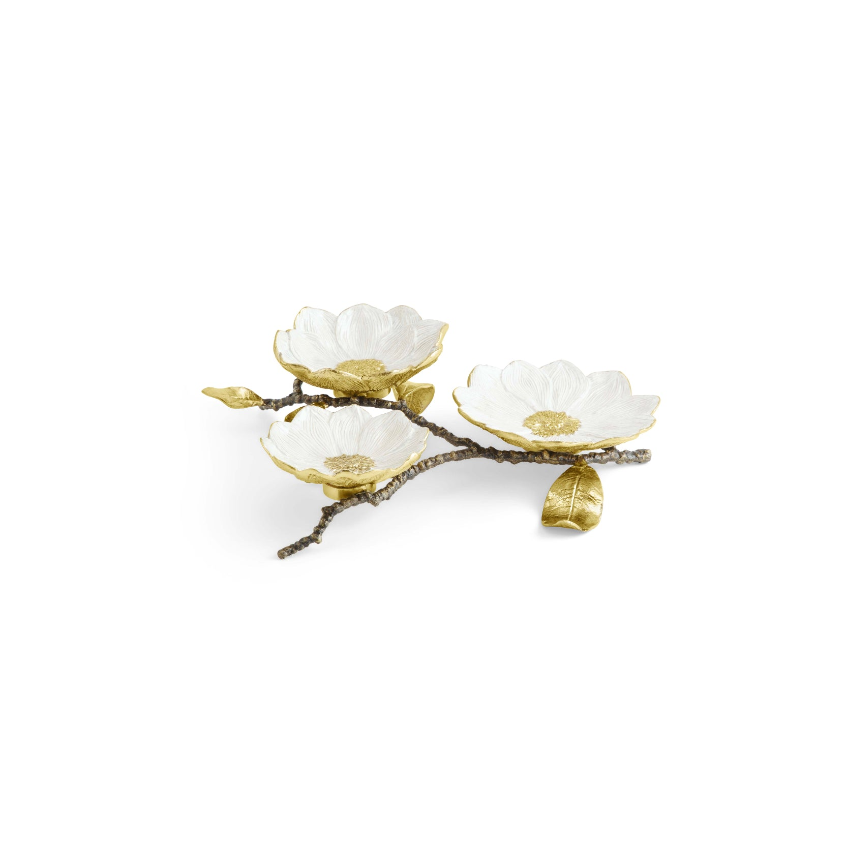 Contemporary Gifts michael aram vintage bloom triple dish Price: $395.00 Qty: 1 2 3 4 5 6 7 8 9 10 11 12 13 14 15 16 17 18 19 20 DETAILS 13""L x 10.5"" W x 4"" H MATERIALS Natural & Oxidized Brass Antique Goldtone Antique Nickel Black Nickelplate