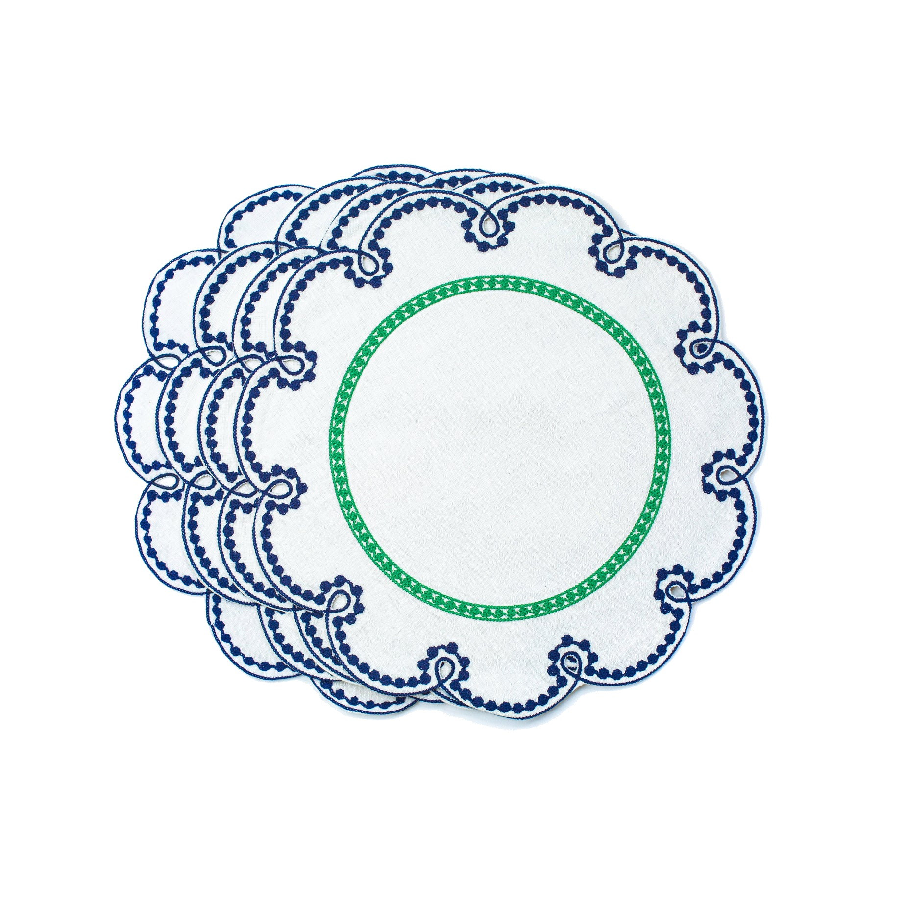 Linens misette fête embroidered linen placemats blue/green, set of four Price: $240.00 Qty: 1 2 3 4 5 6 7 8 9 10 11 12 13 14 15 16 17 18 19 20 Set of 4 Color: Blue/Green Size: 15"" diameter 100% linen with embroidery Made in India 100% linen Machine wash cold, tumble dry low Low iron as needed Do not bleach Do not dry clean