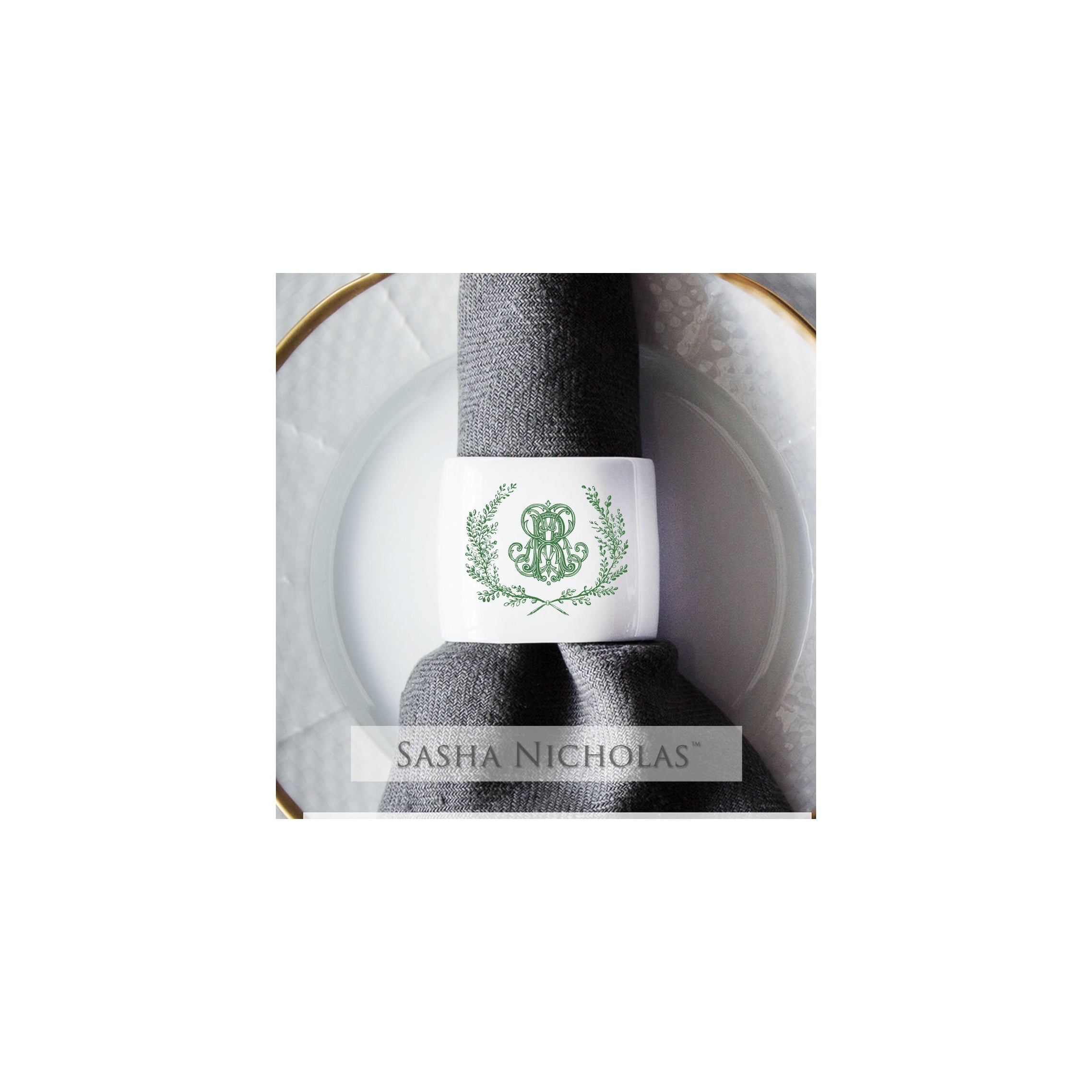 Linens sasha nicholas porcelain napkin ring with couture wreath monogram green Price: $32.00 Qty: 1 2 3 4 5 6 7 8 9 10 11 12 13 14 15 16 17 18 19 20 Special Order Available in every letter of the alphabet