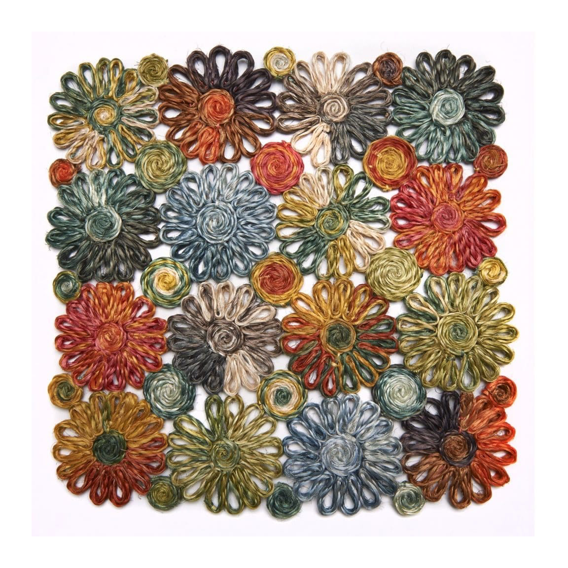 Linens deborah rhodes patchwork daisy square placemat grass multicolor Price: $41.00 Qty: 1 2 3 4 5 6 7 8 9 10 11 12 13 14 15 16 17 18 19 20 15” Square, Abaca, Imported. Care: Spot clean. Do not fully submerge. Air dry.