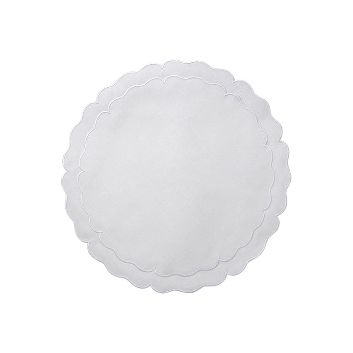 Linens skyros linho scalloped round placemat white / white set of 2 Price: $78.00 Qty: 1 2 3 4 5 6 7 8 9 10 11 12 13 14 15 16 17 18 19 20 Dimensions Material 15.5"" Linen