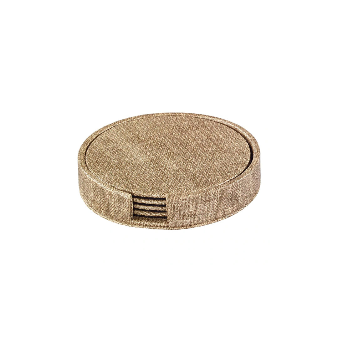 Linens bodrum luster coasters set of four with holder, sand Price: $63.00 Qty: 1 2 3 4 5 6 7 8 9 10 11 12 13 14 15 16 17 18 19 20 coaster sets come in their own holder and have felt on the bottom to avoid scratches. Set of 4 coasters and 1 wine bottle coaster/holder Size: 5"" x 5"" x 1"" without box Material: 100% Phthalate-free Vinyl