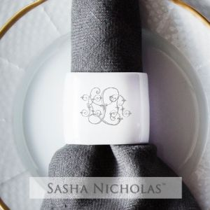 Linens sasha nicholas porcelain napkin ring with script monogram black Price: $32.00 Qty: 1 2 3 4 5 6 7 8 9 10 11 12 13 14 15 16 17 18 19 20 Dimensions: 1.8' x 2.25' x 1.75' Made to orderWe will contact you to finalize all monogram orders.
