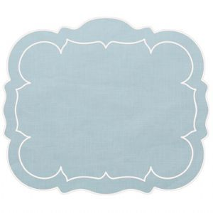 Linens skyros linho ice blue scalloped rectangular placemat set of two Price: $78.00 Qty: 1 2 3 4 5 6 7 8 9 10 11 12 13 14 15 16 17 18 19 20 These exquisite mats are Made in Portugal of 100% pure linen and treated with a light acrylic coating. Caring for the Linho Collection mats is quite easy. Simply wipe a spill clean with a damp cloth! It’s just that effortless, as the mats are extremely stain resistant. Linho mats are designed to add a beautiful monogram, either at the top or center, but are just as exquisite without one. Dimensions Material 18.75' x 15.25' 100% Linen w/ light acrylic coatingWe will contact you to finalize all monogram orders.