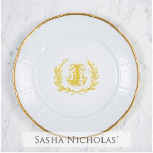 Fine China sasha nicholas weave gold dinner plate with wreath gold monogram Price: $92.00 Qty: 1 2 3 4 5 6 7 8 9 10 11 12 13 14 15 16 17 18 19 20 We will contact you to finalize all monogram orders.