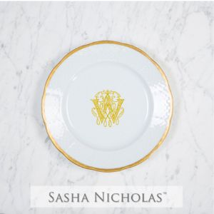 Fine China sasha nicholas weave gold salad plate with couture monogram w in gold Price: $73.00 Qty: 1 2 3 4 5 6 7 8 9 10 11 12 13 14 15 16 17 18 19 20 We will contact you to finalize all monogram orders.