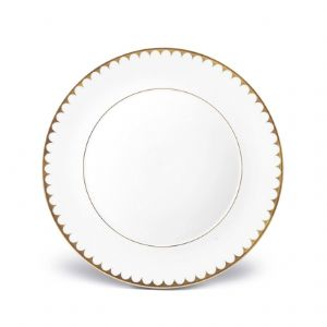Fine China l'objet aegean filet gold dinner plate Price: $160.00 Qty: 1 2 3 4 5 6 7 8 9 10 11 12 13 14 15 16 17 18 19 20 Mirroring the waves of its namesake sea, Aegean Filet dinnerware features a timeless pattern of scales in a delicately scalloped border, hand-applied in 24K gold. SIZE 10.5 D in 27 D cm COLOR / MATERIALS Limoges Porcelain 24k Gold
