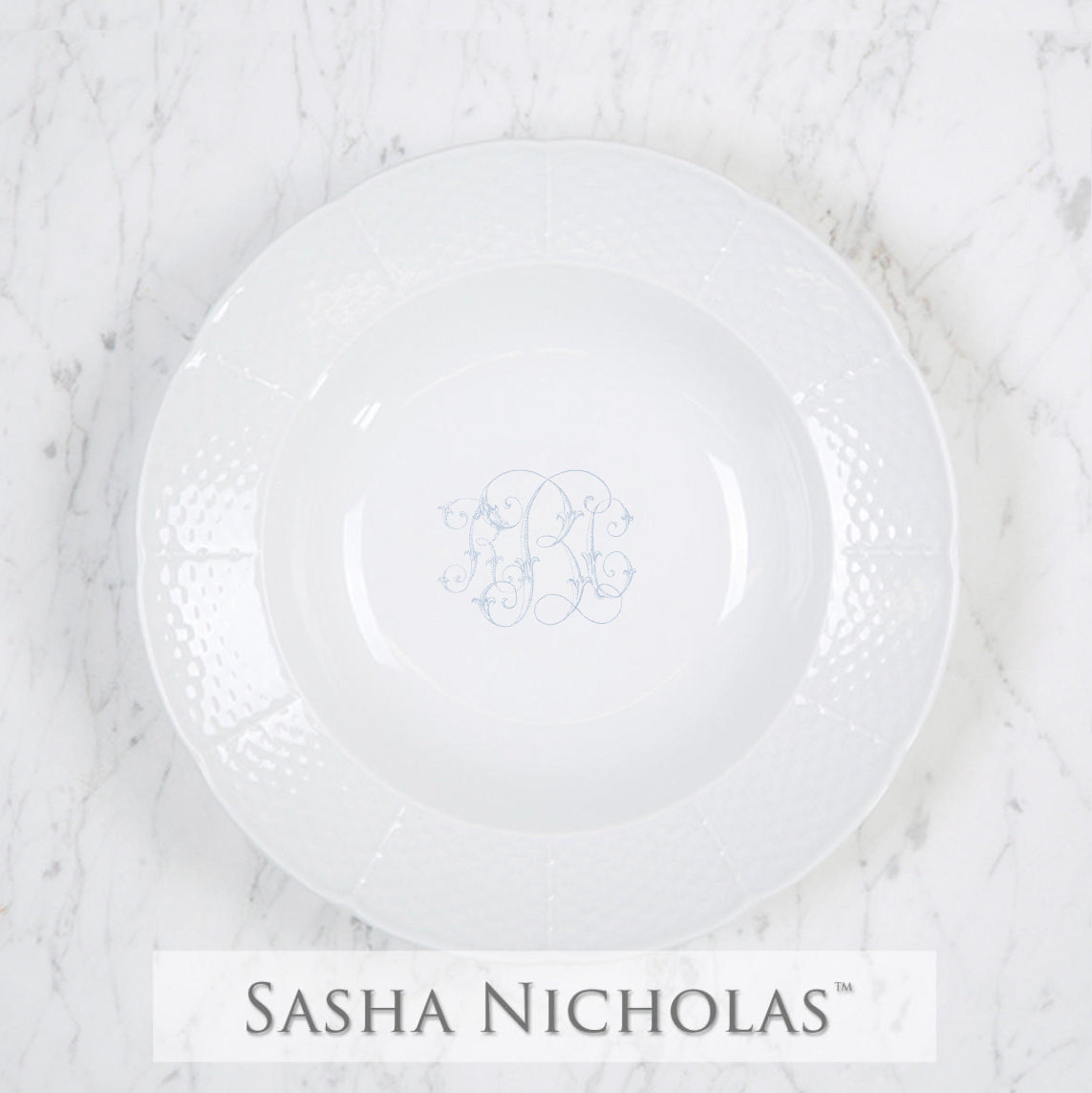 Casual China sasha nicholas weave rim soup plate with monogram, light blue Price: $62.00 Qty: 1 2 3 4 5 6 7 8 9 10 11 12 13 14 15 16 17 18 19 20 Special Order