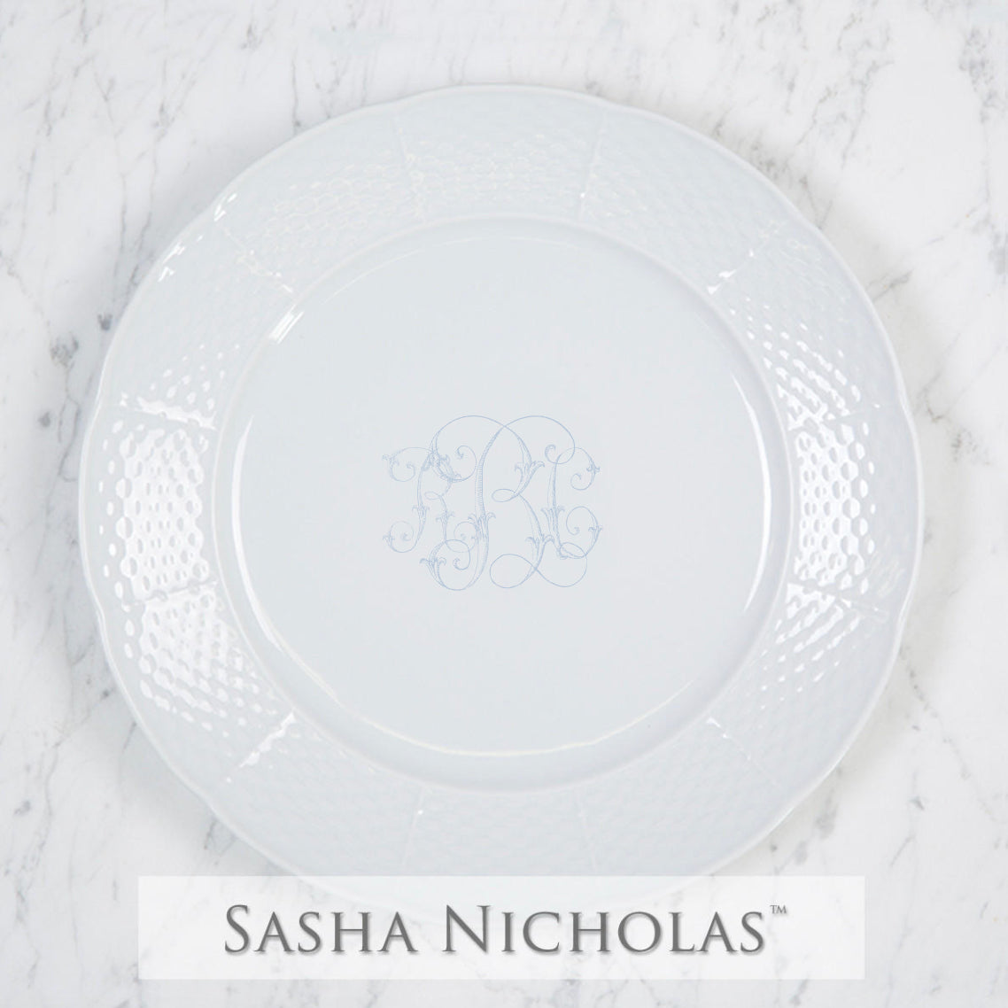 Casual China sasha nicholas weave dinner plate with monogram, light blue Price: $71.00 Qty: 1 2 3 4 5 6 7 8 9 10 11 12 13 14 15 16 17 18 19 20 Special Order